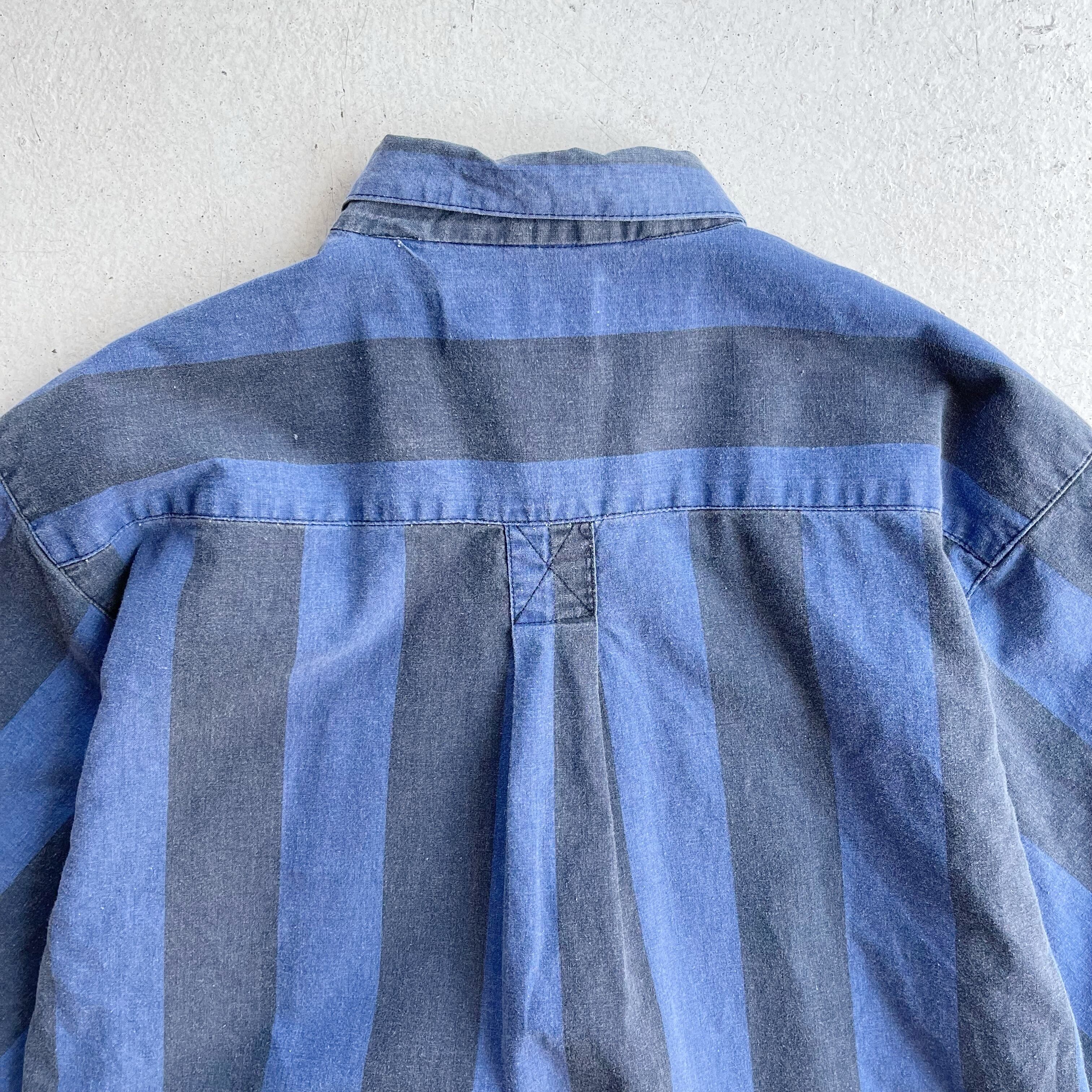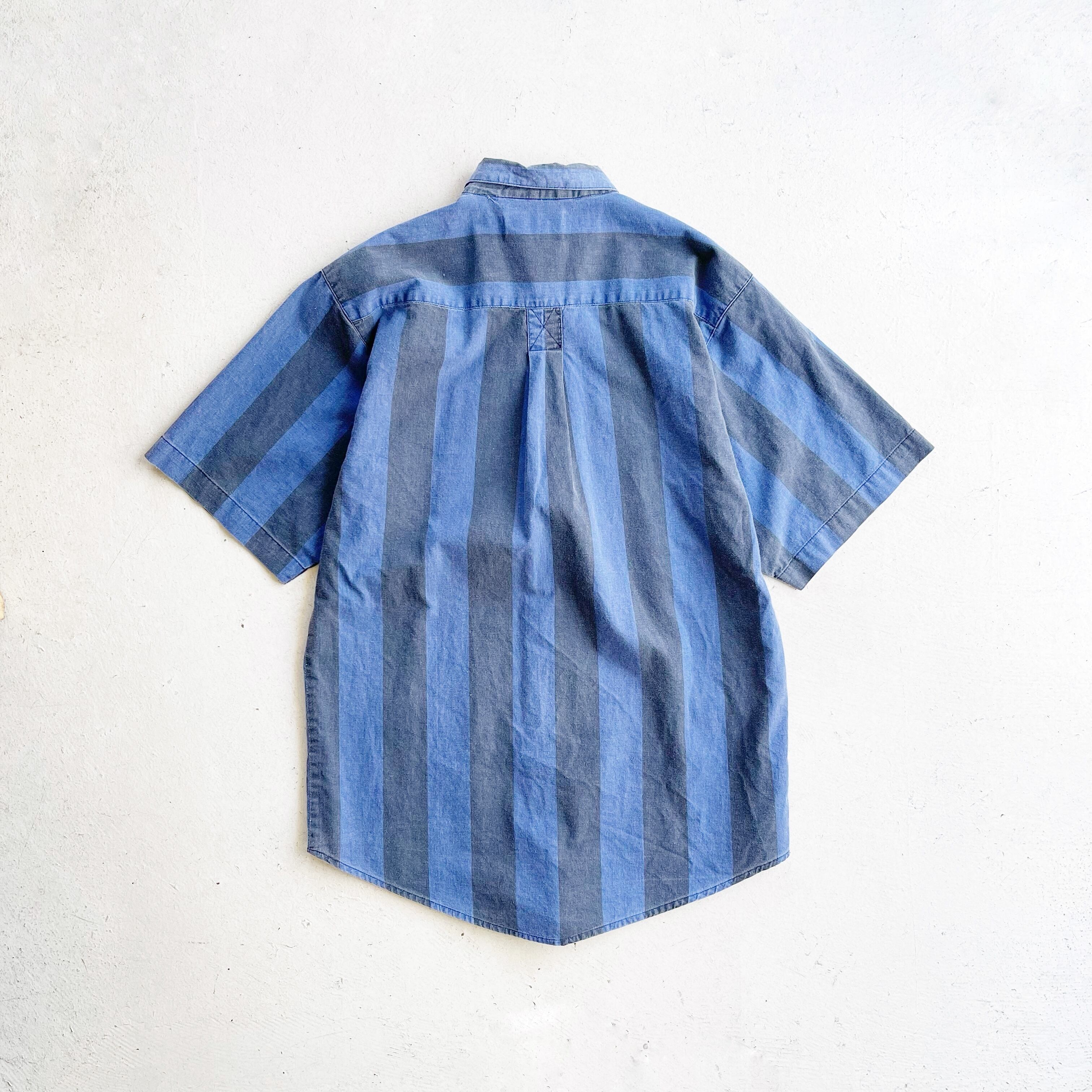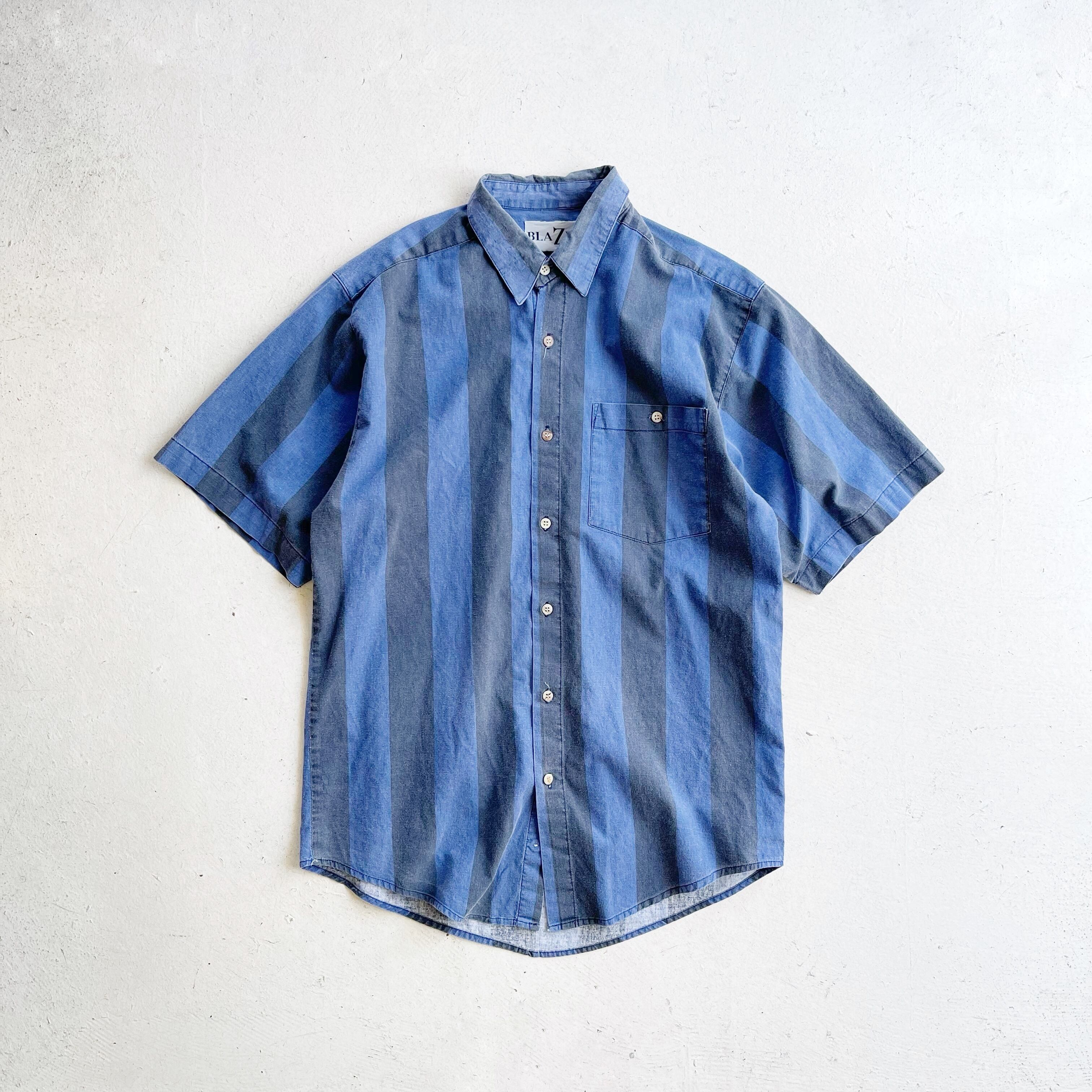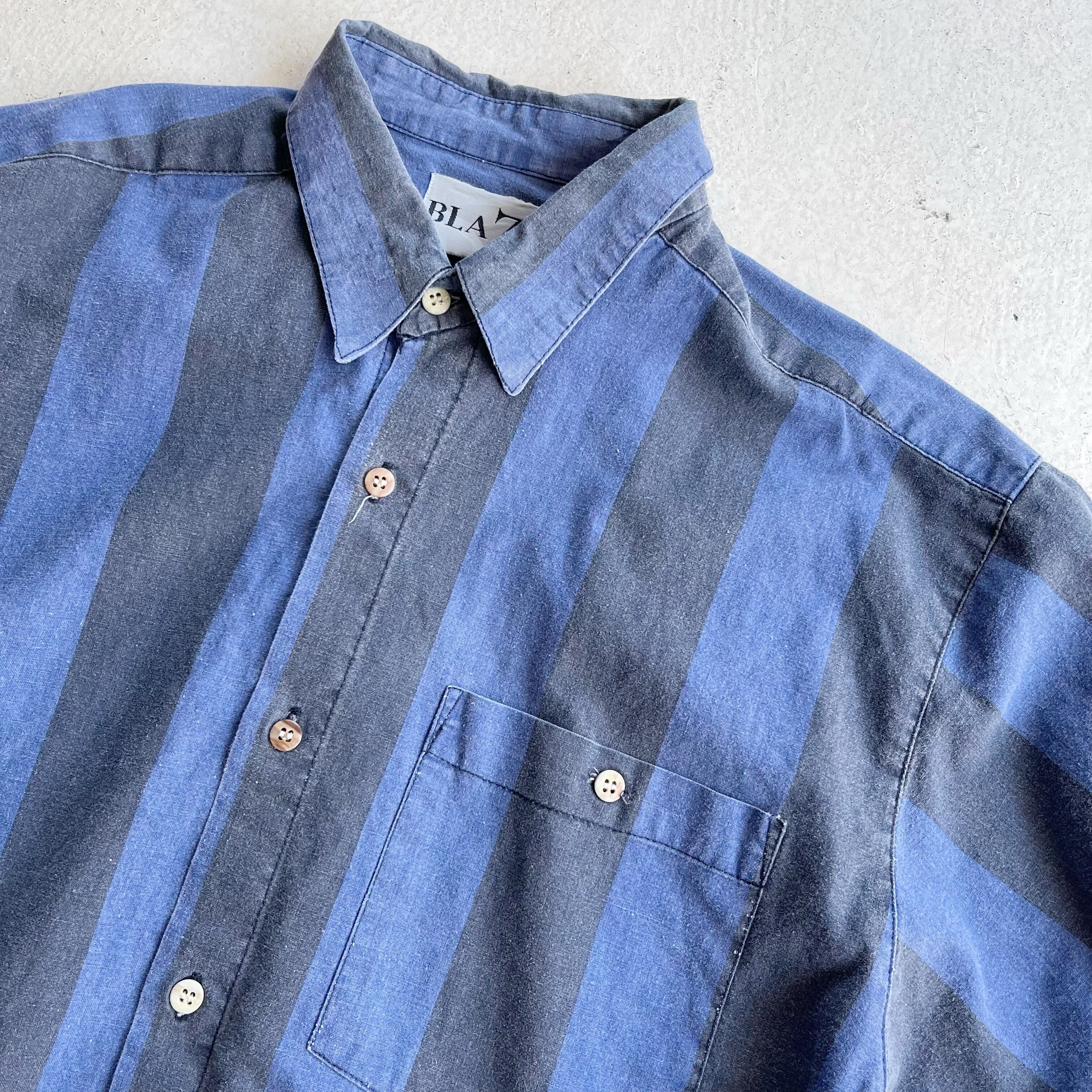 1990s Blue × Black Stripe Fade S/S Print Shirt 【M】